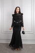 طقم دانتيل خناقي بتطريزات خرزية عالياقة والخصر باكمام شفافة -اسود