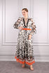 يتميز فستان بتفاصيل ربط في الياقة وفتحة على شكل مثلث لإضافة لمسة من الانفتاح على منطقة الصدر. يتم تزيين الجزء الأمامي بتطريز دقيق ، مصنوع من قماش الشيفون المنقوش، مما يلفت الأنظار. يتم إبراز الخصر بإكسسوار الحزام. يعد هذا الفستان الطويل والمقاس الكبير خيارًا أنيقًا لمناسباتك الخاصة أو الفعاليات.