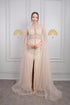 يمنح هذا الفستان إطلالة حالمة تجمع بين الرقي والنعومة. يبرز الياقة العالية مع الجزء العلوي الشفاف لمسة أناقة مميزة، فيما يضفي الفستان المزيّن بالكامل باللؤلؤ والخرز مع الكايب الانسيابي من التول حضورًا ملكيًا راقيًا. أما الشق الأوسط فيبرز الأنوثة بأسلوب أنيق ومتوازن. خيار مثالي لحفلات الخطوبة، كتب الكتاب، والسهرات لكل من ترغب في التألق بإطلالة مشرقة.