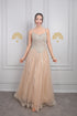 فستان سهرة بحمالات رفيعة وتطريزات كريستالية من "المجموعة الخاصة" -بيج
