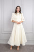 تم تصميم الفستان بياقة تنربط بفرفرات تضيف لمسة انيقة ومميزة. كما تم تصميمه باكمام قصيرة منتفخة تعزز من جمال الاطلالة. مطرز بالخرز من الياقة حتى الخصر تضفي عليه طابعاً فاخراً, بينما ينزل الفستان بشكل منفوش من الخصر بطول ميدي ليمنحك اطلالة انثوية ساحرة. اختياركم لهذا الطقم في مناسباتكم الخاصة او الفعاليات يعد خياراً مثالياً لكم.