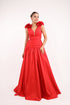 فستان سهرة بتفاصيل زهرة على الكتف وياقة مفتوحة -احمر