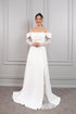 فستان السهرة مكشوف الاكتاف يتميز بتفاصيل الدانتيل التي تبدا من الياقة حتى الاكمام, بينما ينزل الفستان بشكل واسع من الخصر الى الاسفل. تم اضافة تفاصيل الكسرات على الجزء الامامي لاضفاء حركة على التصميم, في حين تم تزيين الشق في التنورة بتفاصيل من الدانتيل لتحقيق تناغم  قي الفستان. سيكون اختيار هذا الفستان الطويل خياراً مثالياً لكم في مناسباتكم الخاصة او الدعوات.