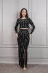 تم تصميم الطقم من قماش الكريب, وتم تزيينه بالخرز والترتر ليبرز جماله. البلوزة ذو الياقة الواسعة والاكمام الطويلة مصممة على شكل كروب, في حين تم تصميم التنورة التي تاتي مع الطقم بطول كامل مع شق امامي لاضفة تفاصيل. سيكون اختيار هذا الطقم اختياراً مثالياً لكم في مناسباتكم الخاصة او فعالياتكم.