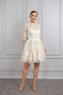 فستان السهرة بياقة عالية من تصميمنا يتميز بتفاصيل شفافة على الياقة والأكمام الطويلة. يتم تزيين الفستان بالكامل بتطريز دقيق وعمل يدوي من الخرز، مما يخلق مظهرًا لافتًا وجذابًا. تنساب التنورة بلطف من الخصر مع طيات، مما يضفي على الفستان طابعًا واسعًا ومبهرًا. هذا الفستان القصير هو خيار مثالي لمناسباتك الخاصة أو فعالياتك.