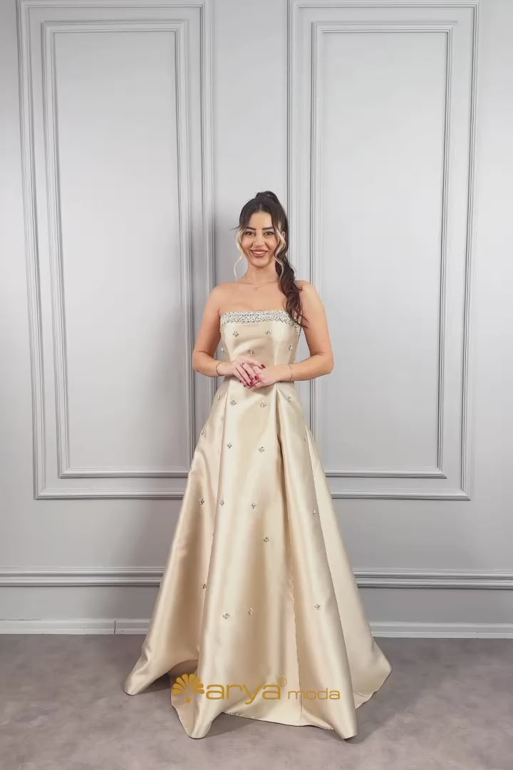 يتميز فستان السهرة بدون حمالات بالكريستالات على الياقة, مع اضافة الكريستالات على كامل الفستان لتوفير التناسق. تم اضافة تفاصيل الكورسيه في الجزء الخلفي من الفستان مع تفاصيل حبل ربط. يتوسع الفستان من الخصر مثل الاميرات. تم تصميم الفستان باستخدام قماش التافتا. اختيارك لهذا الفستان في مناسباتك الخاصة او الفعاليات يعد خياراً مثالياً لك.