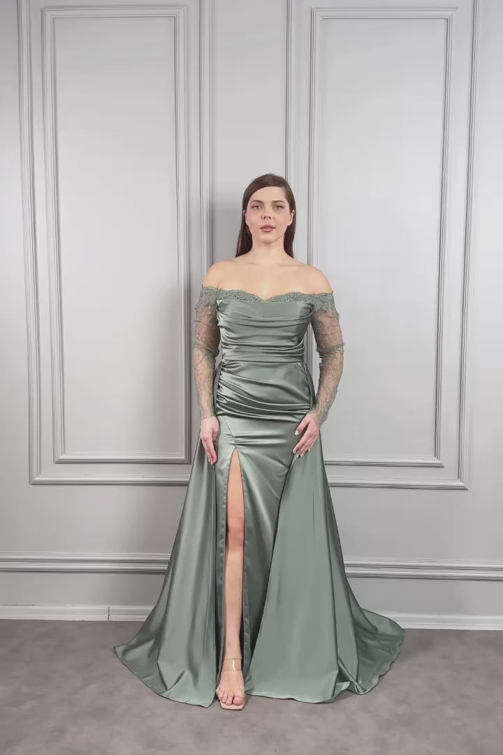 فستان سهرة باكمام دانتيل مكشوف الاكتف -زيتي