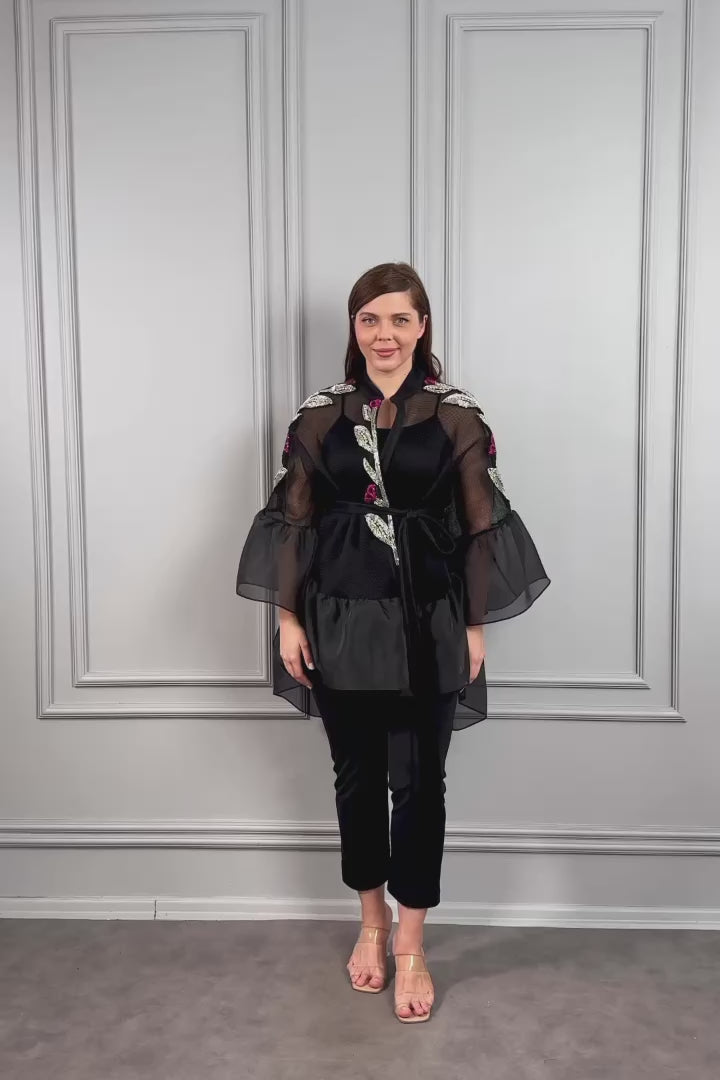 تم تصميم الجاكيت باستخدام قماش شفاف ذو مظهر شبكي بالكامل, مع الاكمام الواسعة التي تضفي عليه لمسة لافتة. تم تصميم الجاكيت ليكون الجزء الخلفي اطول من الجزء الامامي, وتم تزيينه بالكريستالات لاضفاء جمال عالتصميم. مع الحزام الذي يلتف حول الخصر ليضيف تفاصيل انيقة, يمكنكم تنسيق هذا الجاكيت مع قطع اخرى مما يجعله الخيار المثالي لكِ في مناسباتك.