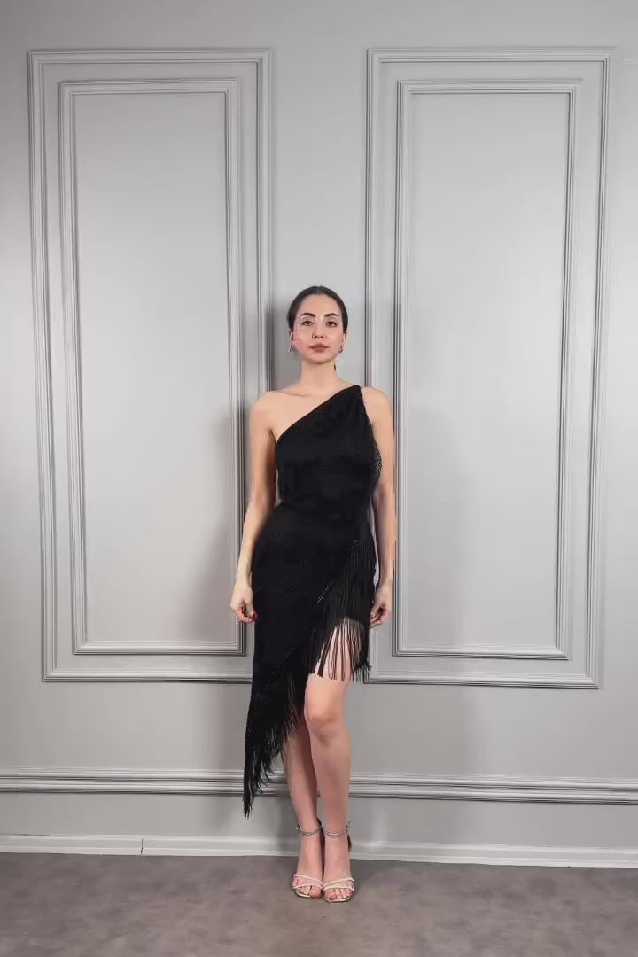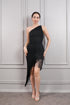 فستان قصير بكتف واحد بتفاصيل شبكة و شرائط شلال -اسود