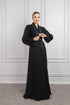 فستاننا مصمم بتفاصيل من الخطوط الفضية التي تمتد من خط العنق حتى الخصر، مع أكمام بالون شفافة تضفي لمسة من الأناقة. الجزء العلوي يشبه تصميم البليزر، بينما التنورة مزخرفة بكسرات تمتد حتى الارض، مما يضيف حركة للتصميم. هذا الفستان الطويل الكامل هو الخيار المثالي لمناسباتك الخاصة أو الفعاليات