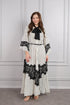 يتميز فستاننا بتفاصيل ربط على الياقة، ويبرز قماشه المزين بالنقاط التي تضفي عليه طابعًا لافتًا. تم تصميم الأكمام الواسعة والتنورة بتفاصيل من الدانتيل، مما يخلق مظهرًا عصريًا وأنيقًا. كما يضيف الحزام الرفيع الذي يلتف حول الخصر لمسة من الحداثة للفستان. سيكون اختياركم لهذا الفستان الطويل ذو الحجم الكبير في مناسباتكم الخاصة خيارًا مثاليًا للحصول على إطلالة أنيقة ومميزة.