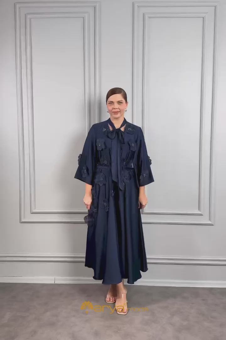 تم تصميم فستاننا مع تفاصيل ربط عند الياقة, بينما تم استخدام قماش الساتان بالكامل لتصميم الفستان. اضيفت تفاصيل الازهار على كامل الفستان ليمنحه مظهراً انيقاً, بينما تم اضافة الاكمام الواسعة لتوفير حركة واناقة اضافية. يتميز الفستان بحزام يلتف حول الخصر لاضفاء مظهر عصري, مع طيات تنساب بشكل رائع. فستان السهرة من المقاس الكبير سيكون الخيار المثالي لك في مناسباتك الخاصة او الدعوات.