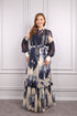 فستاننا المصمم بياقة مزينة بحبل ربط مصنوع بالكامل من قماش الشيفون. يتميز بقماش مزخرف لافت ويُبرز بحزام يحدد الخصر كإكسسوار. مزين بأكمام بالون وتنورة متعددة الطبقات، هذا الفستان ذو الحجم الكبير هو الخيار المثالي لمناسباتك أو فعالياتك الخاصة.