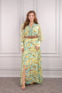 ياقة هذا الفستان مزينة بتطريز دقيق يمتد حتى الخصر، ويتناغم مع قماش شيفون مزخرف لخلق تصميم لافت. تضيف الأكمام الواسعة لمسة ديناميكية، بينما الحزام يحدد الخصر ويعزز المظهر الأنيق. هذا الفستان الطويل الكبير الحجم مزود بتفاصيل شق توفر جاذبية عصرية، مما يجعله خيارًا مثاليًا لمناسباتك الخاصة.