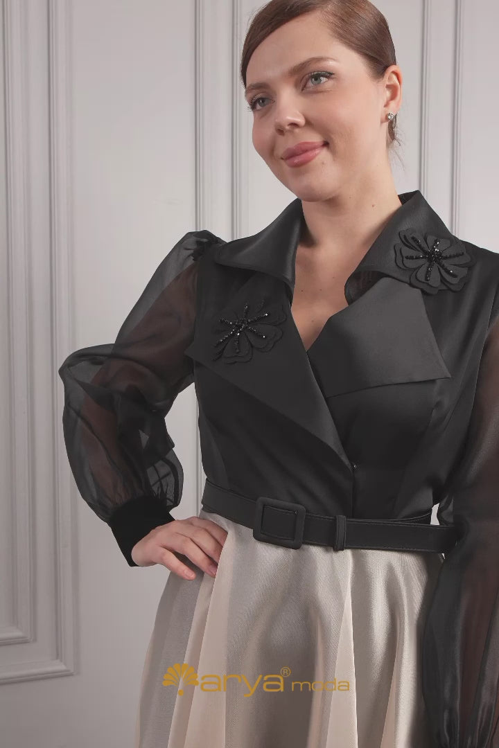 فستاننا بياقة القميص مزين بزهور على الياقة ويتميز بأكمام بالون شفافة ملفتة. وينسدل الفستان بشكل فضفاض من الخصر ليمنح مظهرًا عصريًا مع تفاصيل فريدة عند الحافة. الخصر مزود بحزام لإضافة تماسك للتصميم. هذا الفستان المخصص للمقاسات الكبيرة يُعد خيارًا مثاليًا لمناسباتك الخاصة أو الفعاليات.