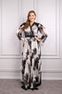 فستاننا ذو الياقة على شكل مثلث مزين بالخرز على الأكتاف ويتميز بأكمام واسعة لإضفاء حركة إضافية. مزين بحزام يحدد الخصر، ويبرز الفستان المصنوع من الشيفون بنسيجه المزخرف. هذا الفستان الطويل من المقاس الكبير هو خيار أنيق لمناسباتك الخاصة.