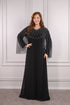 فستاننا ذو الياقة على شكل مثلث والأكمام الطويلة مصنوع بالكامل من قماش الكريب، ويتدفق بحرية من الخصر إلى الأسفل. هذا الفستان المميز الطويل يناسب المقاسات الكبيرة، ويتميز بأكمام جناح  مقطوعة بشكل غير متماثل مزينة بالتول وبتفاصيل حجرية لامعة. يعد خيارًا مثاليًا لمناسباتك الخاصة أو فعالياتك.