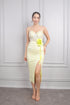 فستان سهرة ميدي لامع بحمالات رفيعة و وردة عالخصر -اصفر