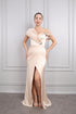فستان سهرة مصمم بكتف واحد ومزين بتفاصيل طبقات انيقة, بينما يأتي الكتف الاخر بتصميم منسدل ليوفّر توازناً جذاباً في الإطلالة. صنع بالكامل من قماش الساتان الفاخر, تم تزيين منطقة الصدر والاكتاف بتطريزات كريستالية تضيف لمسة فاخرة. وصممت تنورة الفستان بفتحة امامية ليمنحه مظهراً جريئاً وجذاباً. اختياركم لهذا الفستان في مناسباتكم الخاصة او الفعاليات يعد خياراً مثالياً لكم.