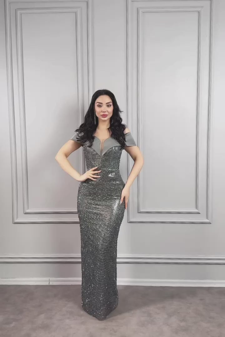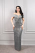 فستان سهرة لامع مكشوف الاكتاف مطرز بالخرز- رمادي