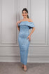 فستان سهرة مطرز بالخرز والترتر مكشوف الاكتاف -سماوي