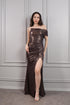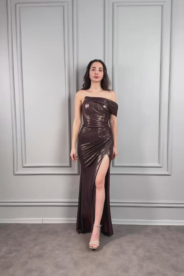فستان سهرة لامع بكتف واحد بتفاصيل طبقات وفتحة امامية -نحاسي