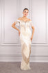 فستان سهرة باكتاف مكشوفة وخيوط لامعة متدلية مع تطريز كريستالات -بيج