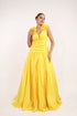 فستان سهرة بتفاصيل زهرة على الكتف وياقة مفتوحة -اصفر