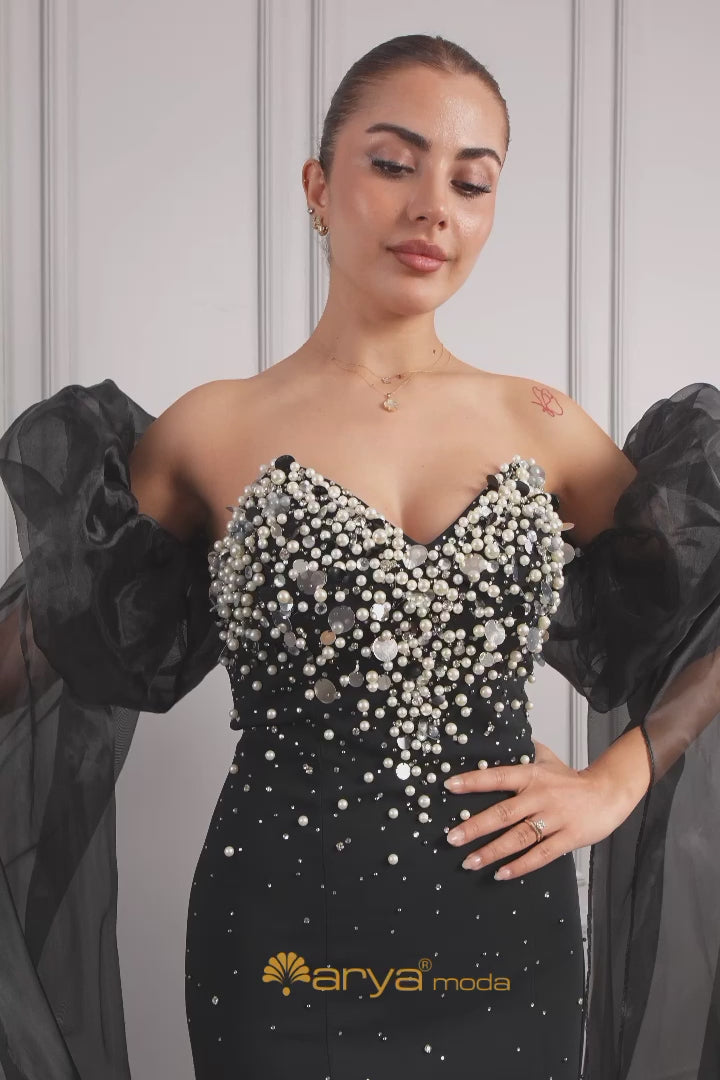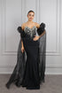فستان سهرة سترابلس مع أكمام مزخرفة باللؤلؤ وتفاصيل كاب -اسود