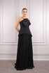 فستان سهرة بحمالات رفيعة وزهرة كبيرة وتصميم مكسر في الاسفل -اسود