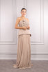 فستان سهرة بحمالات رفيعة وزهرة كبيرة وتصميم مكسر في الاسفل -بيج
