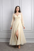 فستان سهرة دانتيل بياقة مثلثة واكمام واسعة مقاس كبير -بيج
