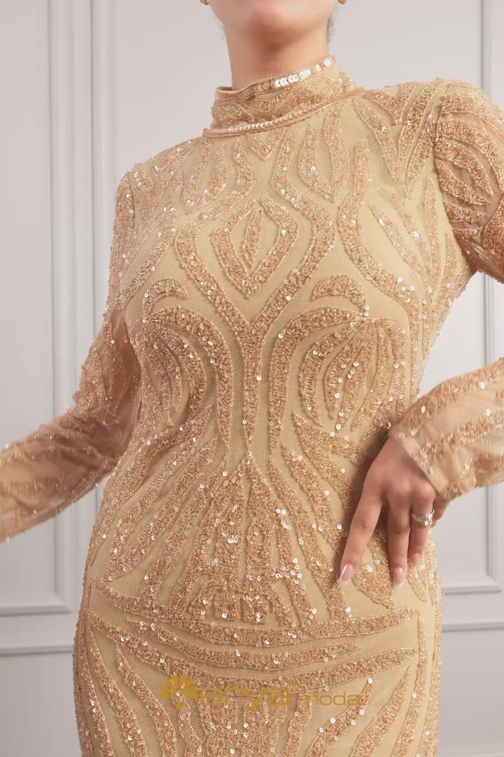 فستان السهرة ذو الياقة الطويلة مطرز بالكامل بالخرز مما يبرز تصميمًا لافتًا. توفر الأكمام الطويلة مظهرًا أنيقًا، بينما يضيف تفصيل الظهر المكشوف قليلاً لمسة من الأناقة. هذا الفستان القصير هو خيار مثالي للمناسبات الخاصة أو الفعاليات.