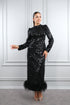 فستان سهرة مزخرف بالترتر بياقة عالية وتنورة مع تفاصيل من الريش -اسود