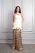 فستان سترابلس بتفاصيل وشاح ناعمة وتنورة مطرزة بالترتر، يجمع بين الأناقة العصرية واللمسة البراقة. تأتي قصّة الصدر المكشوفة لتبرز جمال الأكتاف وتمنح مظهرًا أنثويًا راقيًا، بينما يضيف الوشاح لمسة من الانسيابية والرقي. الجزء السفلي من الفستان مزين بـترتر لامع يعكس الضوء مع كل حركة ليمنح إطلالة تخطف الأنظار, ليكون خيارًا مثاليًا للمناسبات الراقية كحفلات الزفاف والخطوبة والتخرج.