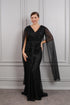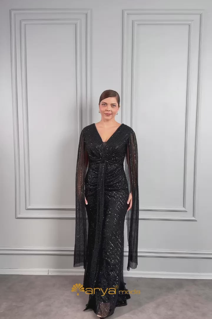 فستان سهرة لامع مطرز بالترتر بياقة مثلثة وتفاصيل كاب عالكتف مقاس كبير -اسود