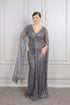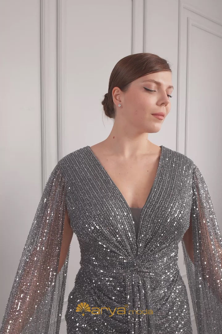 فستان سهرة لامع مطرز بالترتر بياقة مثلثة وتفاصيل كاب عالكتف مقاس كبير -فحمي