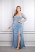 فستان السهرة ذو الياقة المستطيلة يتميز ببلوزة شفافة مزينة بالحجارة والخرز، مما يضفي تصميمًا ساحرًا. التنورة مصنوعة من قماش الشيفون المبطن. مع ذيل طويل وشق عميق في الساق، يتميز هذا الفستان الطويل بمظهر رائع. اختيارك لهذا الفستان لمناسباتك الخاصة سيكون خيارًا أنيقًا وجذابًا.