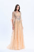 فستان سهرة مطرز بالخرز والترتر مع حزام كريستالي باكمام متوسطة مزينة بربطة -ذهبي
