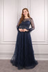 فستان سهرة بتفاصيل ريش على الاكمام وظهر شفاف مطرز بالخرز -كحلي
