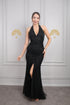 فستان سهرة بتصميم هالتر مطرّز بالكامل بالخرز، يتميّز بفتحة ظهر جريئة تمنحه لمسة لافتة. قصّة حورية البحر مع شق أمامي تضيف أنوثة وجاذبية راقية. خيار مثالي للأعراس والمناسبات الخاصة.