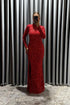 فستان سهرة بتفاصيل شفافة على الياقة وفتحة مرصعة بالترتر من "المجموعة الخاصة" -احمر