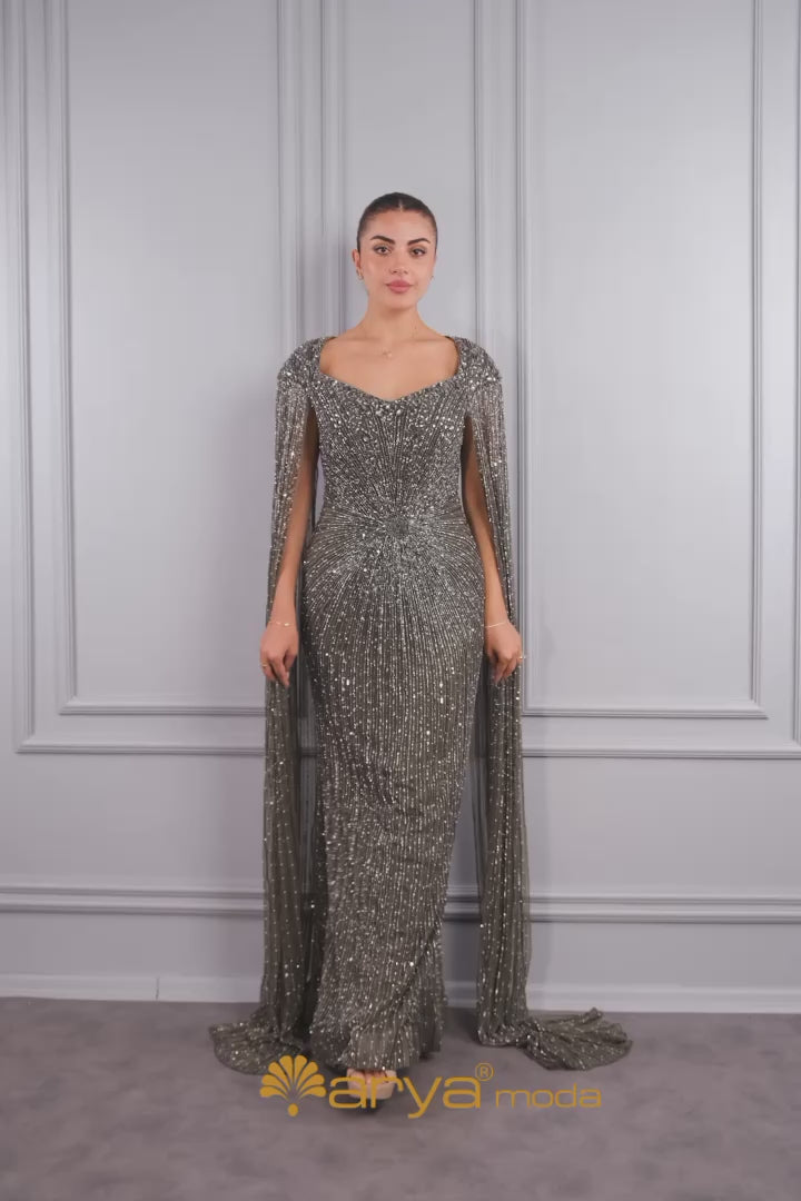 تم تصميم هذه الفستان بياقة مستطيلة، ويتميز بكاب يمتد من الأكمام حتى الأرض، مما يخلق قوامًا أنيقة. الفستان مزين بالكامل بالكريستالات والخرز المتقنة، مما يضيف لمسة لامعة. قصة السمكة الطويلة تعزز الأناقة العامة، مما يجعل هذا الفستان خيارًا فاخرًا للغاية لمناسباتك الخاصة أو الفعاليات.