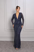 فستان سهرة بياقة مثلثة مغطاة بقماش شفاف, مزين بالكامل من التطريزات الخرزية اللامعة. تم تصميم الفستان بقصّة ضيقة تعزز القوام, ويتميز بفتحة خلفية في الظهر تزيد من جراءة المظهر. باكمام طويلة شفافة. اختياركم لهذا الفستان في مناسباتكم الخاصة او الدعوات يعد خياراً مثالياً لكم.