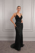 يتميز فستان السهرة بحمالات رفيعة وياقة مفتوحة، وهو مغطى بالكامل بتفاصيل من الخرز اللامع والترتر لإضفاء تأثير لافت. يتميز الفستان بفتحة كبيرة في الظهر مع رباطات حبل تبرز المظهر الجريء، كما أنه يناسب الجسم تمامًا. مزين بشق طويل على الفخذ من الأمام، مما يجعل هذا الفستان الرائع خيارًا مثاليًا لمناسباتك الخاصة أو فعالياتك.
