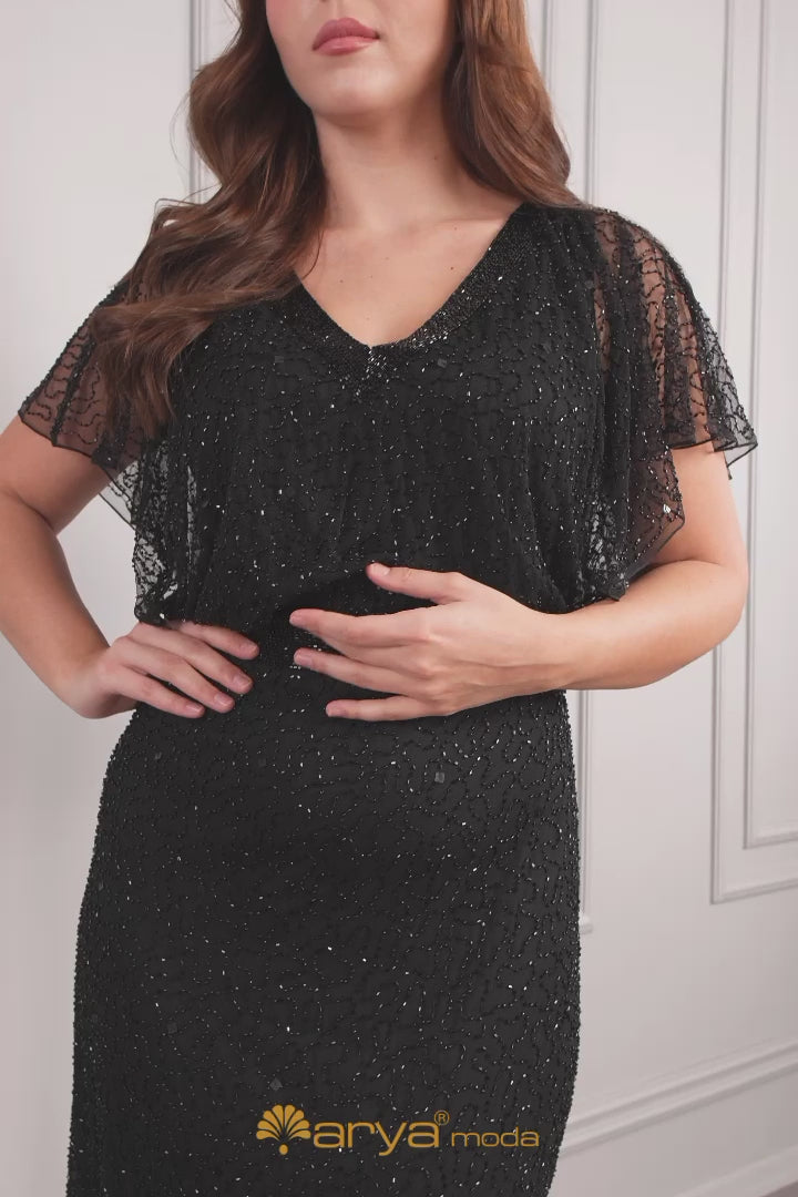 فستان سهرة مقاس كبير بأكمام فضفاضة وياقة على شكل مثلث مزين بالخرز من "المجموعة الخاصة" -اسود