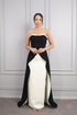 فستان سترابلس باللونين الأسود والأبيض, تتميز بتباينها الكلاسيكي وتعطي لمسة فاخرة، فيما تبرز القصّة المكشوفة أنوثتك بأسلوب راقٍ. يزدان الصدر بتفاصيل اللؤلؤ التي تمنح بريقاً ناعماً وأناقة، بينما يضفي الذيل الانسيابي طابعاً درامياً يرافق خطواتك كأنك على السجادة الحمراء. التصميم الداخلي المنسجم مع القوام يعزز جاذبيتك ويبرز خطوط جسدك برشاقة. مثالي لحفلات التخرج، الأعراس، الدعوات الخاصة وحتى الامسيات، حيث يمنحك إطلالة مميزة توازن بين البساطة والفخامة.