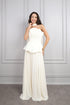 تم تصميم فستان السهرة بدون حمالات ليهبط بشكل واسع من الخصر إلى الأسفل باستخدام قماش الشيفون الرقيق. أُضيفت قطعة إضافية تُحاكي شكل الكورسيه لتضفي تناغمًا على التصميم بينما يُحيط بالجسم بشكل أنيق. كما تمت إضافة إكسسوار من الشيفون حول العنق لإضفاء لمسة عصرية. سيكون هذا الفستان المثالي لمناسباتكم الخاصة أو دعواتكم.