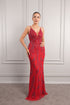 فستان سهرة طويل بحمالات رفيعة وياقة مفتوحة مطرز بالخرز من"المجموعة الخاصة" -احمر