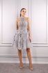 فستاننا ذو ياقة خناقية يتميز بتصميم شفاف من الأمام، مع زخارف من اللؤلؤ تزين الجزء العلوي للفستان وصولًا إلى التنورة. التصميم ينبض بالحياة مع تنورة قصيرة متسعة مزينة بتفاصيل ريش. هذا الفستان هو الخيار المثالي للحفلات بعد الحدث أو مناسبات الخطوبة.